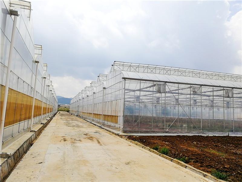 2、 温室顶部一般采用聚乙烯无滴长寿膜、PO膜、PEP膜等覆盖,外层防紫外线、内层防结露,四周墙体采用聚乙烯无滴长寿膜或聚碳酸脂中空板(PC板)。