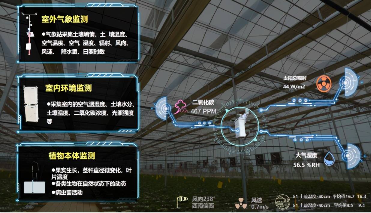 温室大棚通过搭载运用物联网系统的温度传感器、湿度传感器、Ph值传感器、光传感器、CO2传感器等设备,检测环境中的温度、相对湿度、Ph值、光照强度、土壤养分、CO2浓度等物理量参数,通过各种仪器仪表实时显示或作为自动控制的参变量参与到自动控制中,保证农作物有一个良好的、适宜的生长环境。远程控制的实现使种植人员在办公室就能对多个温室大棚的环境进行监测控制。采用无线网络来测量获得作物生长的最佳条件,可以为温室大棚精准调控提供科学依据,达到增产、改善品质、调节生长周期、提高经济效益。