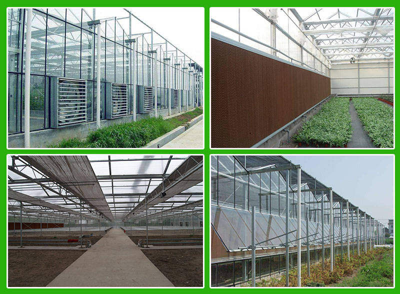 温室大棚风机水帘是利用水幕蒸发降温,在我国的农业、畜牧业中应用广泛,具有环保、效果显著、经济可靠等优点。水帘(湿帘)是一种特种纸质蜂窝结构材料,其工作原理是“水蒸发吸收热量”这一自然物理现象,即水在重力的作用下,由上往下流,在水帘(湿帘)波纹状的纤维表面形成水膜,当流动的空气经过水帘(湿帘)时,水膜中的水会蒸发吸收空气中的热量,带走大量的潜热,使经过水帘(湿帘)的空气湿度降低,从而达到降温目的。