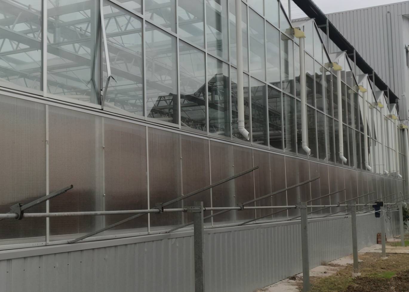 玻璃温室的外遮阳系统是在温室顶部通过电机驱动的一种可以活动的遮阳材料,外遮阳系统可以很高地将光线阻隔在温室外面,起到遮阳降温的作用。也可以根据具体需求通过传感器,用手机APP或是PC端来自动或是手动来调节阳光进入温室的多少,以达到控制光照、温度的目的。使用强度较好的外遮阳网可以达到预防冰雹的作用。