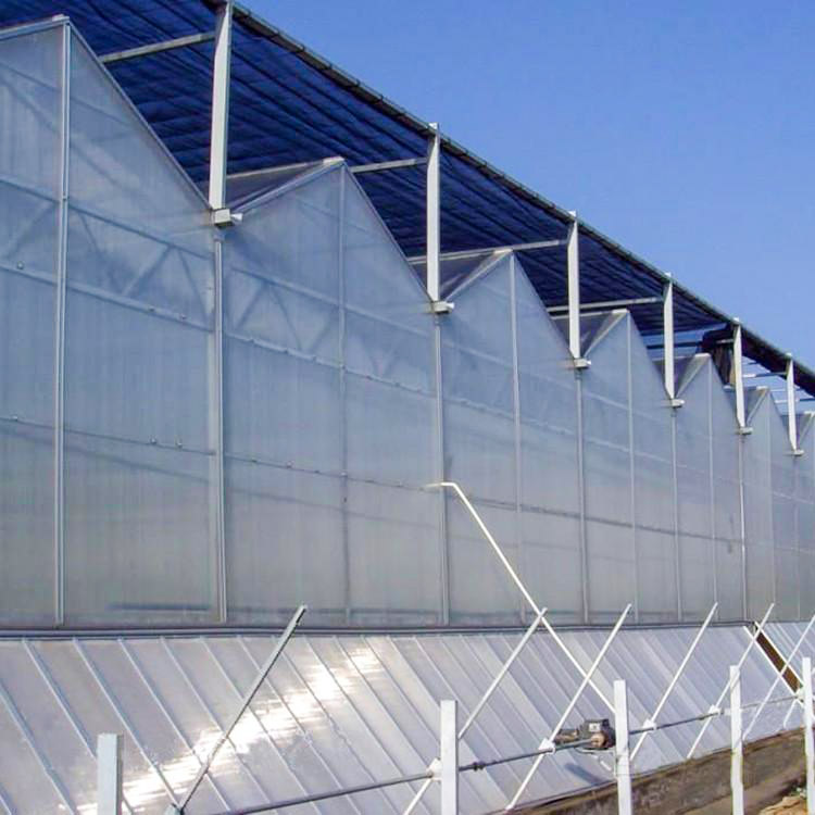 铝合金型材或专用链接密封件链接密封,外形美观漂亮;具有防滴雾功能,再开天沟下设置结雾水收集槽,可以将结露水收集后导到温室端部排除,减少病虫害的发生。保温节能效果比单层效果好,冬季可节省大量燃料,但选光性比玻璃相比较差。内部宽敞明亮,操作空间大,温室利用率高。
